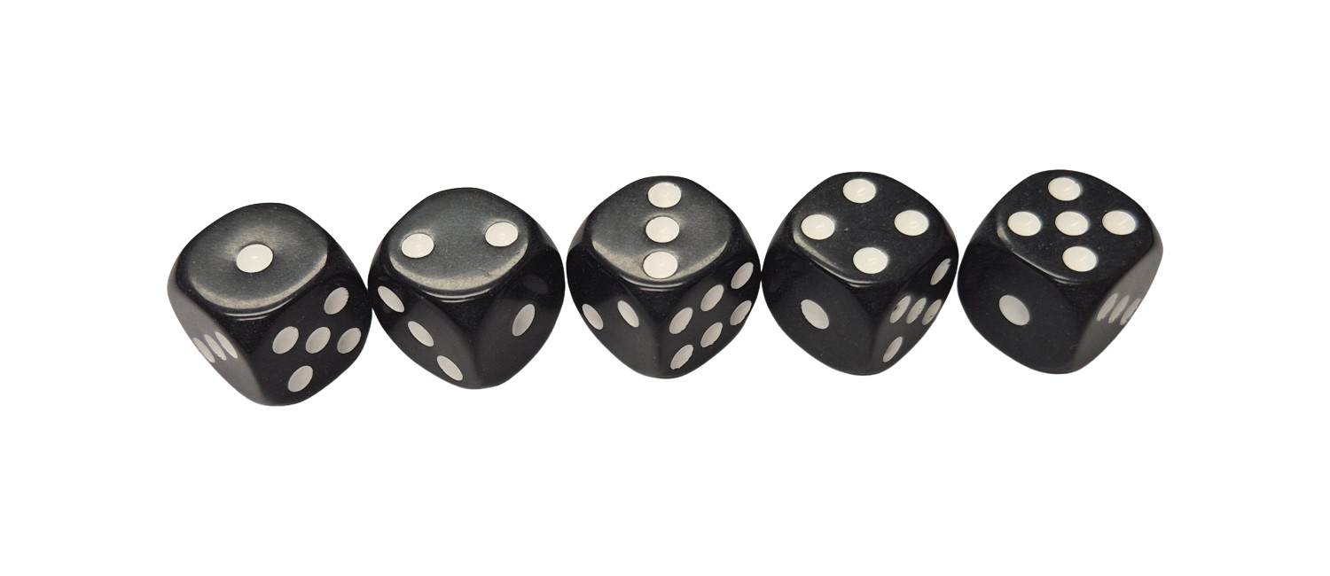 Nr kat: 115YYDC110/2 Kolor: czarny Zestaw 5 kości do gry w kolorze czarnym o średnicy 15 mm. Kości do gry przeznaczone do gier planszowych, fabularnych, bitewnych, hazardowych i innych. Wiek: 3+.