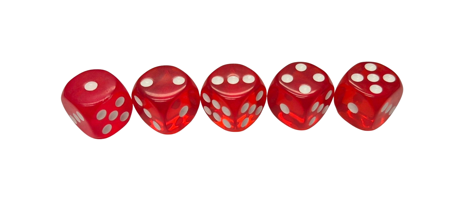 Nr kat: 115YYDC110/1 Kolor: czerwony Zestaw 5 kości do gry w kolorze czerwonym o średnicy 15 mm. Kości do gry przeznaczone do gier planszowych, fabularnych, bitewnych, hazardowych i innych. Wiek: 3+.